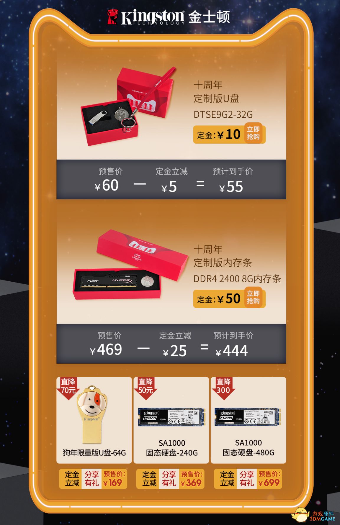 本次预售活动中,还有明星爆品参与,它们分别是:金士顿A1000固态硬盘、金士顿A400固态硬盘、金士顿狗年限量版U盘等 。
