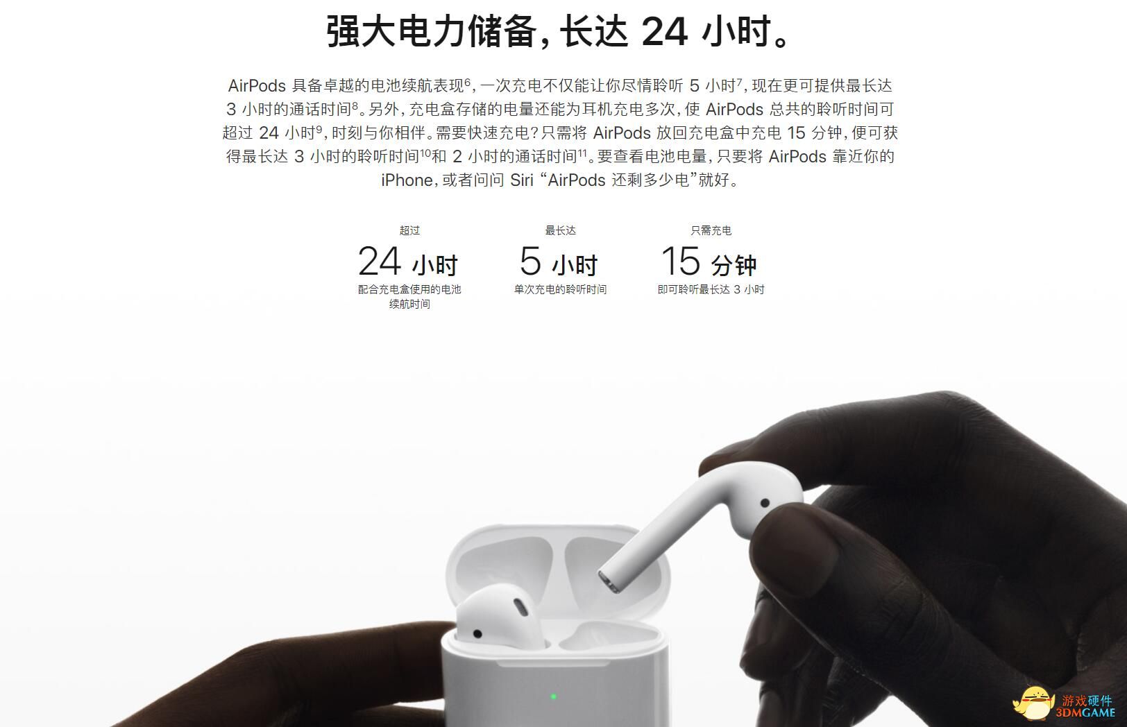 不过换上W1后的音乐聆听续航规格不变,耳机本身一次的音乐续航力为5小时,搭配电池盒可达到最高24小时,快速充电也与前一代同为充电15分钟即可提供3小时音乐聆听,但语音通话续航力有些许提升,耳机单次充电通话续航力由第一代的2小时提升到3小时。另外新版AirPods也继承前一代可不分左右边的单耳使用,以及可搭配光学感测器、动作加速感测器可自动控制音频体验,以及驱动麦克风通话与Siri。
