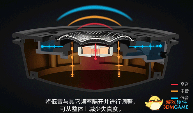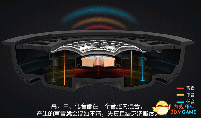 HyperX Cloud Alpha 紫晶游戏耳机的双音腔则采用为每只单元配备两个音腔,通过声学机械分频设计来延迟混响,将高、中、低音分开处理,从而扩宽声场,并让低音的下潜变得更加深邃。而目前市面上的耳机均采用单音腔+单发声单元的设计,区别于音箱产品,耳机发声单元覆盖耳朵,与耳膜几乎没有距离,纵向声场不够深,容易让玩家感觉耳机里面传出来的声音只存在于脑中,而并不存在于游戏空间内,声场不自然,缺乏真实感,并容易混淆敌人的准确方位。而采用双音腔后,能让来自不同方位的脚步声、枪声、环境声等音效不再混为一团,声音远近的距离呈现出层次感,更具辨识度。