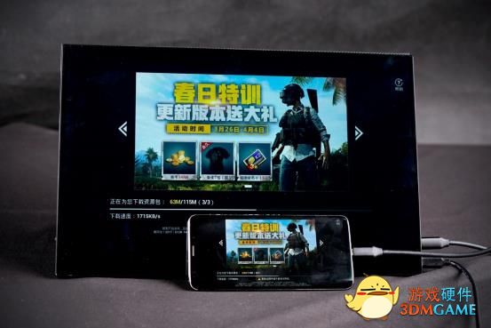 接下来笔者就使用支持TV-OUT的三星S9+手机实际操作一下,连接方式非常简单,只需要通过显示器自带的Type-C To Type-C转换线,游戏画面就可以自适应屏幕出现在显示器中了,这样一来我们就能够观看更大尺寸的屏幕操作手机了。