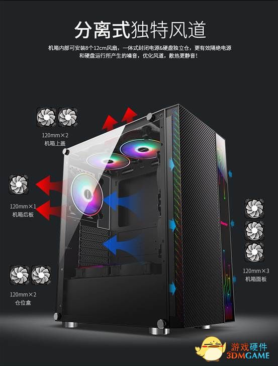 GX520S可以装8个12cm风扇,独立电源仓,优化风道,散热更静音