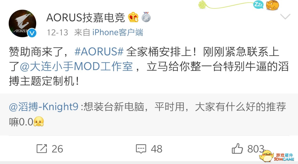事件开端于12月13日,英雄联盟滔博战队中单@滔搏-Knight9发布微博,说想要一台新电脑请网友推荐配置,随后技嘉官方微博@AORUS技嘉电竞火速回应,表示将邀请大连小手MOD工作室使用AORUS全家桶系列,为Knight9打造一台性能顶尖的定制电竞主机。
