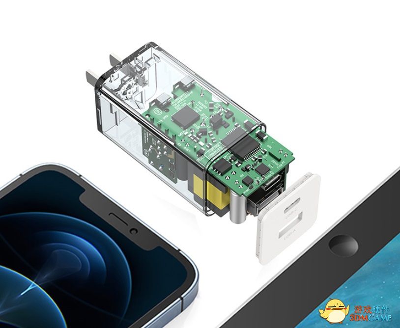这款充电器采用简洁的立方体造型,插头固定不可折叠。官方表示,由于使用了 GaN 氮化镓芯片,充电器的功率密度可达 1.02W/cm³,相比苹果 61W PD 充电器体积小一半以上。