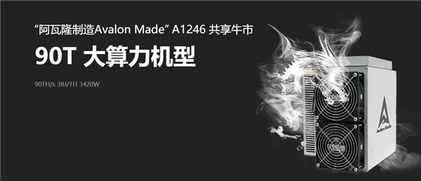 A1246 AvalonMiner矿机是嘉楠科技去年发布的最新一代比特币矿机,单台算力高达90TH/s,是当前算力最强的矿机之一,功耗3420W,能效比38J/TH,使用的是7nm ASIC矿机芯片。