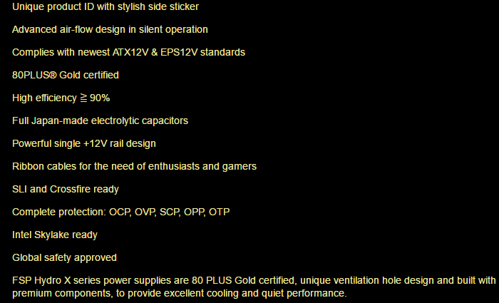 关于Hydro X电源,全汉(FSP)并没有向市场透露太多,但对于系统组装发烧友来说它是可炙手可得的,“如此安静的工作状态,超过90%的高效电能转换率,全日系电容的精挑细选,为节电设计的超强单+12V rail,扁平电缆线,以及支持OCP、OVP、SCP、OPP、OTP在内的全方位的保护机制。”