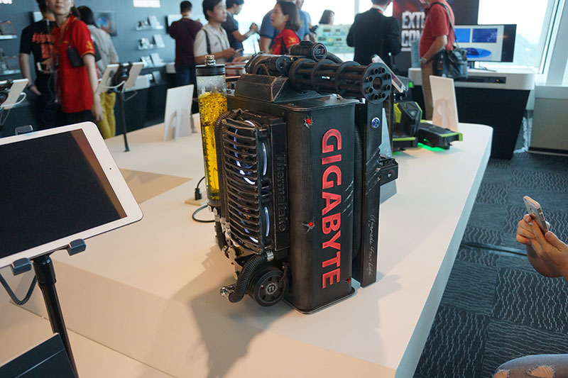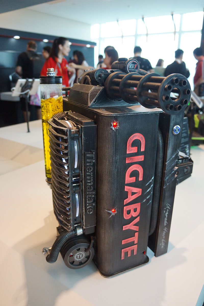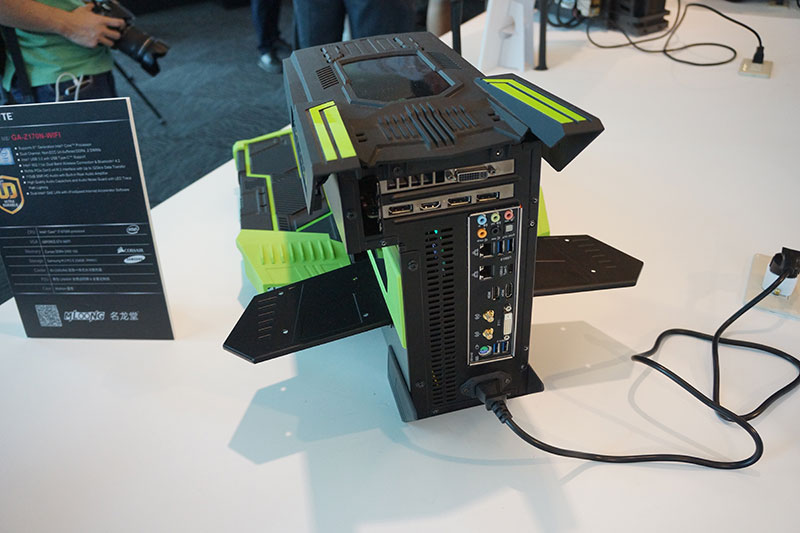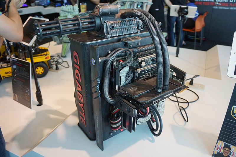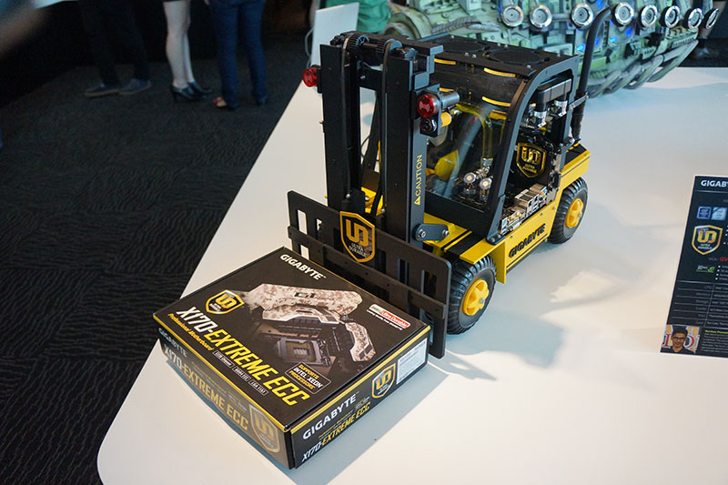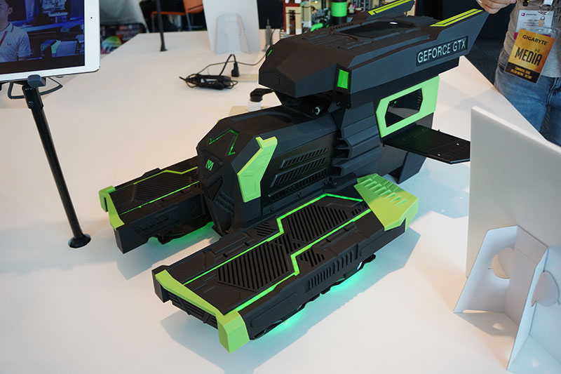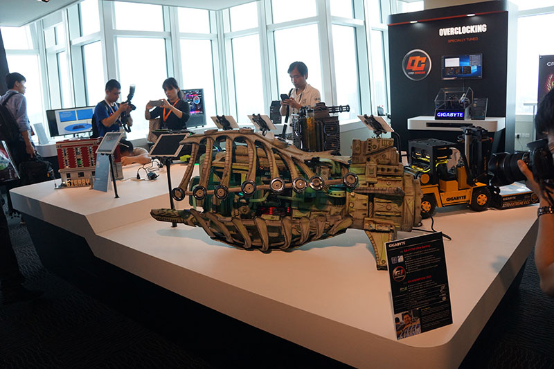 看看技嘉的骨架mod,这款mod在设计上充分考虑到了散热的问题,除此之外还把造型设计的这么别致,想想这东西放在家里是不是有一种置身侏罗纪公园的感觉。看到旁边的叉车了吗,那个并不是玩具哦,而是实实在在的另外一个机箱mod。