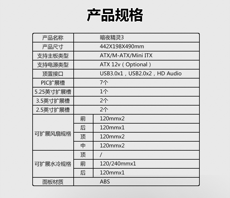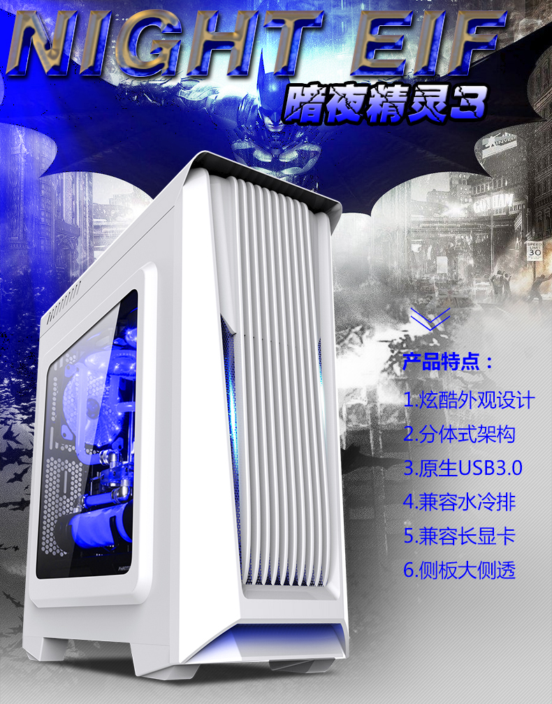 暗夜精灵3分白色和黑色两款颜色,造型冷酷,个性十足。条纹内置铁网设计,演绎环保理念。水冷与风扇实用机箱空间于一体,如行云流水般流畅,体现高效散热,为玩家营造安静舒适的环境,这也成为其最大卖点之一。