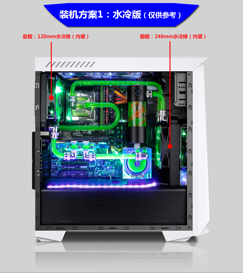 超大箱体空间,让水冷装机游刃有余,240mm规格前板水冷排安装、后板120mm水冷排安装,充分保证机箱高效运转能力。