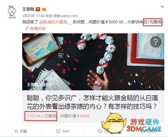 今日有网友花了5000RMB在微博问答上,问王思聪:“聪聪,你见多识广,怎样才能火眼金睛的从白莲花的外表看出绿茶婊的内心?有怎样的技巧吗?”这个价值5k的问题,王思聪只回答了4个子:熟能生巧。并引来了17.6万人围观。
