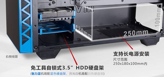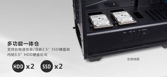 航嘉MVP2在电源仓顶部设计了2个2.5″SSD硬盘架,电源仓内部也加入了2个免工具自锁式3.5″HDD硬盘位,方便玩家构建个性化存储方案。