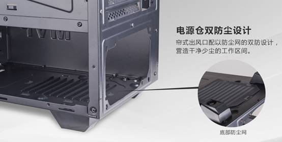 为了减少灰尘进入机箱内部,航嘉MVP2还在电源仓位置设计了双防尘设计,帘式出风口配以防尘网的双防设计,可轻松营造干净少尘的工作区间。
