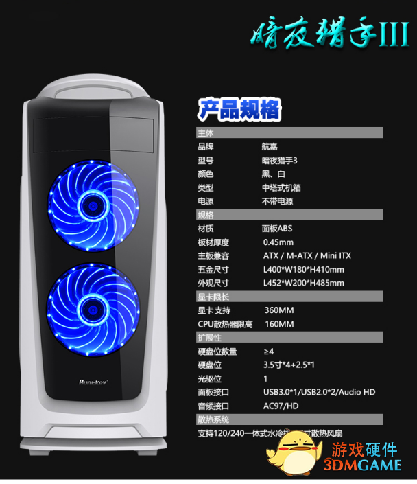 外观方面,航嘉暗夜猎手3机箱推出:白、黑两款颜色。由航嘉研发团队倾力打造,配置侧透面板,采用凸包设计。