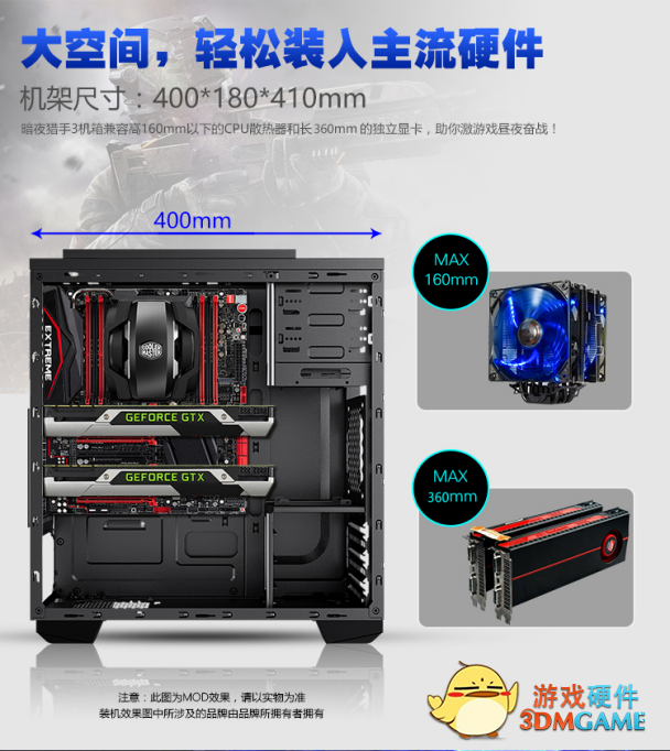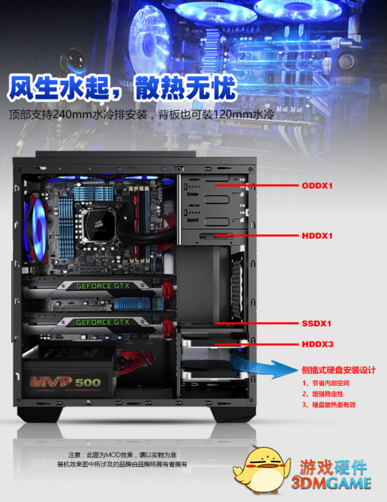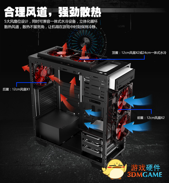 最后,航嘉暗夜猎手3在散热方便也做足了文章,5大风扇位设计,并可同时兼容一体式水冷设备,立体化循环散热,让散热不留死角,让你想怎么散就怎么散。科技环保的创新为了就是实现绿色DIY,更为你在体验产品中提供环保保障,让生活娱乐带来绿色DIY的全新选择,而航嘉暗夜猎手3机箱则诠释了“从好到更好”的先进DIY理念。