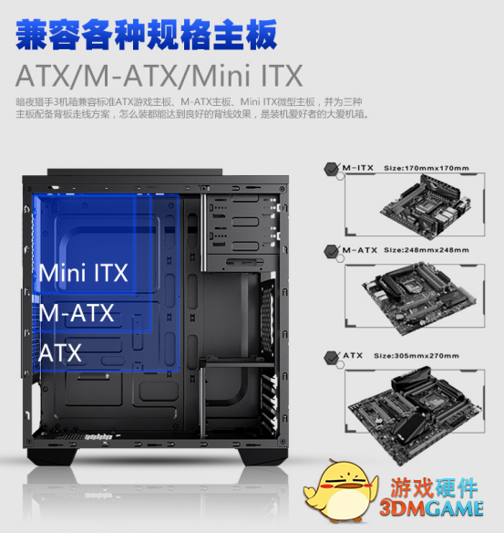 航嘉暗夜猎手3机箱兼容标准ATX游戏主板、M-ATX主板、MiniITX微型主板,并为三种主板配备背板走线方案,让DIY老司机们怎么装都可以达到好的背线效果,这样的设计深受DIY老司机们的欢迎。