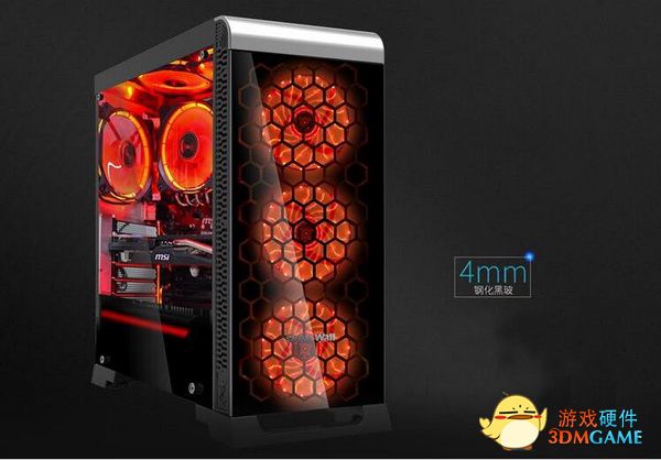 长城V200RGB的前面板是一块用4mm钢化黑玻璃打造出来的,在炫酷光影效果上可谓算是一支强心针,左侧乃是一块亚克力板,超大尺寸,机箱内部硬件一览无遗,展现光污染的亮丽效果更是轻轻松松。