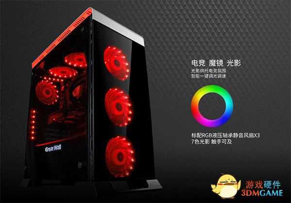 为提高主机的散热性能,机箱在前面板配备了3个RGB风扇,除了为主机带来更好的散热性能以外,还能让玩家玩转酷炫的RGB灯光效果,预留顶部两个12cm风扇安装位以及机箱背部也预留了1个RGB风扇安装位。无论是散热性能还是玩RGB光污染灯光,长城T600都能很好地支持使用。