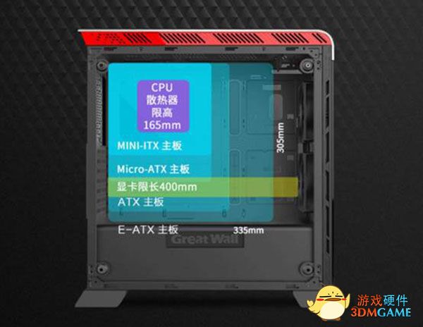 挑选游戏机箱,内部空间宽裕是游戏玩家挑选机箱的重要标准。长城T600机箱尺寸为487×226×520mm,兼容市面所有E-ATX/ATX/M-ATX/ITX大小规格主板,同时支持高度达到165mm的CPU散热器以及400mm的显卡,能够轻松安装旗舰级GTX1080Ti独立显卡,能够满足高端玩家组装顶级主机的需求。