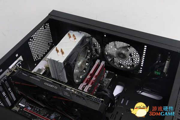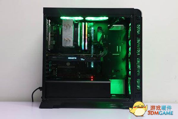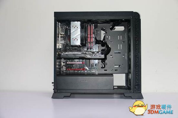 各硬件安装完成后效果展示,得益于全模组电源的优点以及机箱宽大的空间设计,安装过程十分顺畅,同时机箱内部也很干净整洁,显卡安装长达278mm的技嘉GTX1060显卡后,机箱剩余的空间位置还很充足,对于玩分体水冷的玩家来说,这款机箱的承载能力十分强悍。
