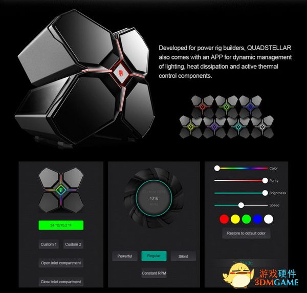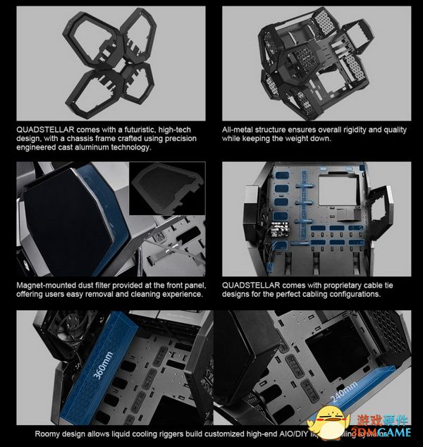 DeepCool公司的QuadStellar四瓣机箱在2017年1月首次在国际消费电子展亮相,现在终于开始销售。QuadStellar采用高档的TriStellar设计,使用两个对角线相对的凸起部分以及中央轮毂作为主机箱的主隔间,另外两个突出部分组成电源和存储隔间。