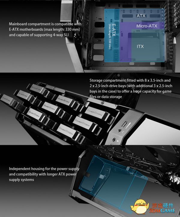 DeepCool QuadStellar机箱为E-ATX全塔设计(全塔是用来装E-ATX主板、很长的显卡、很多的硬盘的,E-ATX多数是服务器主板;中塔是指能装ATX尺寸主板的机箱,也就是标准尺寸,中塔通常就是我们平时说的大机箱了),这意味着除了标准的ATX和更小的主板外形之外,还有EATX主板的空间。