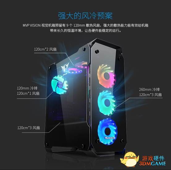 MVP Vision机箱面板采用4mm分离式钢化玻璃,与采用冲孔网或钢板前面板的机箱相比,更加美观。再配上面板内发光风扇,可以呈现出非常炫酷的灯光效果,大幅提升机箱整体的颜值。而且,可以搭配多种灯光模式,让用户在灯光效果上可以随意掌控。当然,如果玩家充分利用了MVP Vision所有风扇位,就可以打造360°立体散热系统,实现高效循环散热。