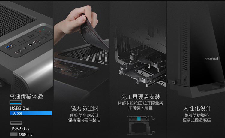 机箱顶部采用高品质SGCC镀锌钢板材质设计,连接前面板与顶盖的部分采用弯曲流线型自然过度,工艺相当考究,因此也得到了广大游戏玩家的青睐。另外机箱还有很多人性化的设计也是可圈可点的,如硬盘的免工具安装,橡胶防护脚垫和便捷式搬运底座等等。