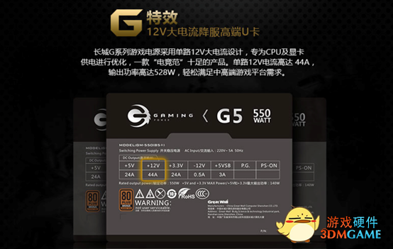 长城G5全模组游戏电源采用单路12V大电流设计,单路12V输出电源能效更高,凭借着功率分配更灵活,兼容性大幅度提升和动态响应更加迅速等功能优势,该电源能够很好地满足高端CPU以及显卡的供电,能够轻松搞定中高端的游戏主机。