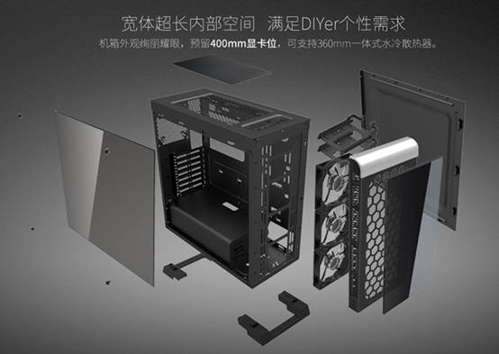 除了外观颜值,我们来进一步了解它的规格空间和散热等实用性方面的特点。长城V200采用了宽体超长的设计方案,机箱尺寸为461*200*467mm,预留400mm的超长显卡位,支持360mm一体式水冷散热器,除了兼容性强,更是满足DIYer进行各种富有创意的个性玩法。