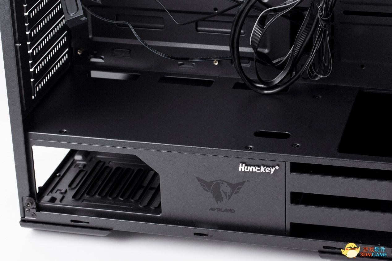 此外,机箱自身也提供了RGB按键(在机箱顶部),可以手动切换机箱风扇灯光的颜色。同时,机箱的电源仓留有展示电源LOGO的窗口,不但可以展现高端电源的铭牌,也可以在这里自行添加灯条等第三方配件来打造别致的灯光。