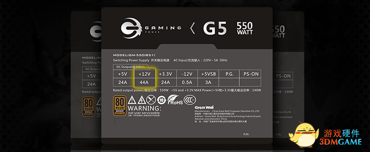 除了能效高,长城电源G5的供电能力也比较强。电源采用单路12V大电流设计,对CPU和显卡的供电进行了优化。从参数铭牌上可以看出,长城电源G5的电流能够达到44A,输出功率则高达528W,中高端游戏平台所使用的显卡和CPU供电都可以轻松满足。