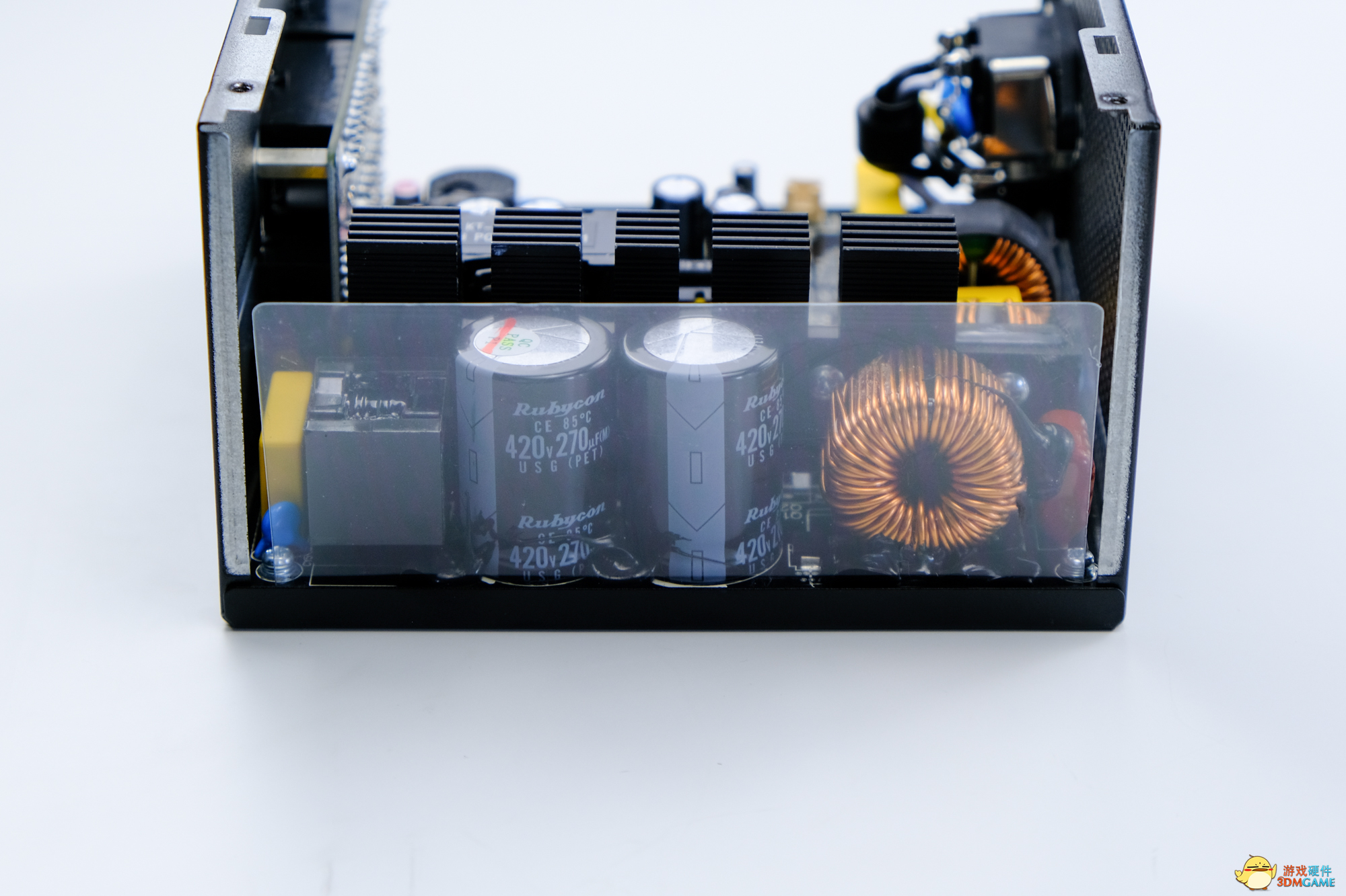 影驰电竞大师GL650采用了成熟的主动式PFC+LLC谐振+DC-DC供电架构,电源拥有齐全的一二级EMI电路,配套采用了两颗红宝石270μF规格的主电容。整体的供电架构比较常规,用料非常扎实,对于一款550W功率的电源来说属于比较高的规格。