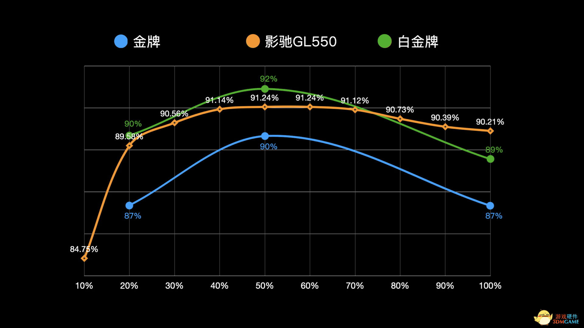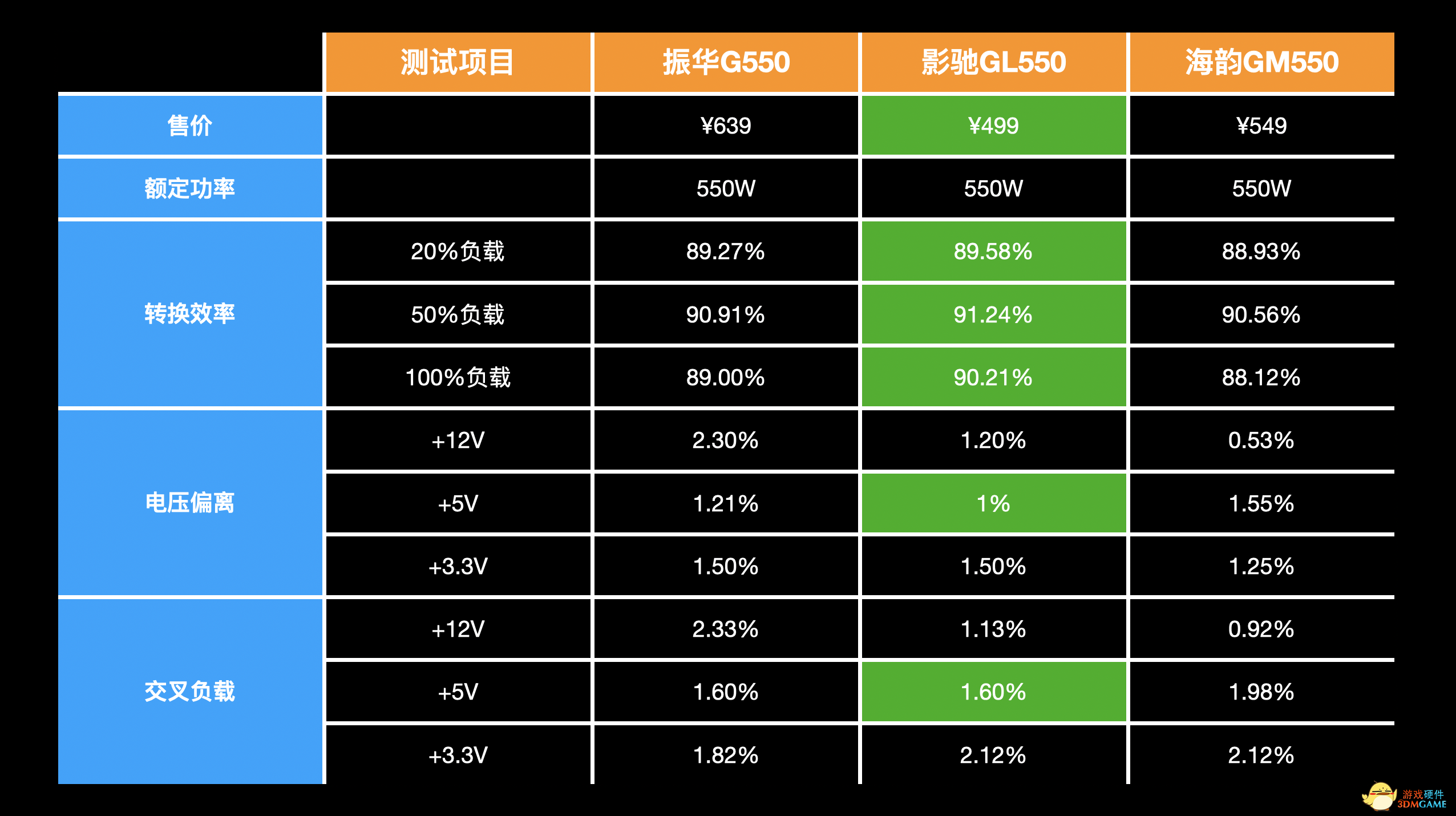 我们在最后也引入了同样为550W功率级别的另外两家主流电源厂商的测试数据用于对比。可以看到影驰的这款GL550在转换效率部分的表现的确高于同级别金牌电源,在电压偏离和交叉负载测试项目中,影驰的GL550则和另外两款电源互有胜负。但是如果我们也可以看到,影驰GL550仅499元的售价是要低于另外两款竞品的,所以其本身的性价比是非常高的。