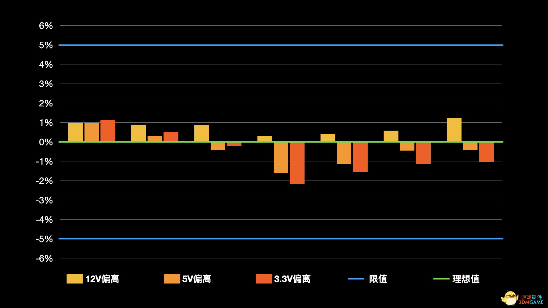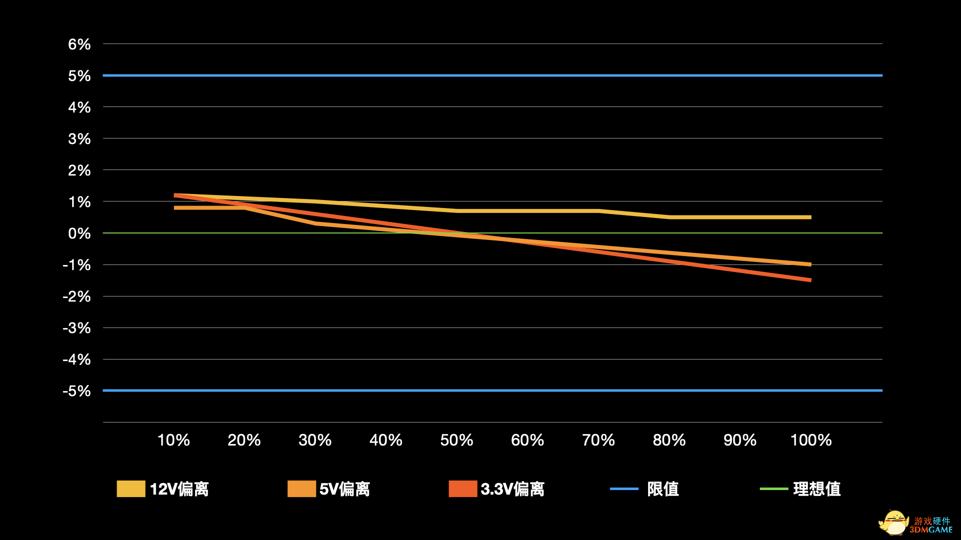 最后测试交叉负载的偏离值,同样下限标准是5%。实际测试+12V偏离1.12%、+5V偏离1.54%、+3.3V偏离2.13%。