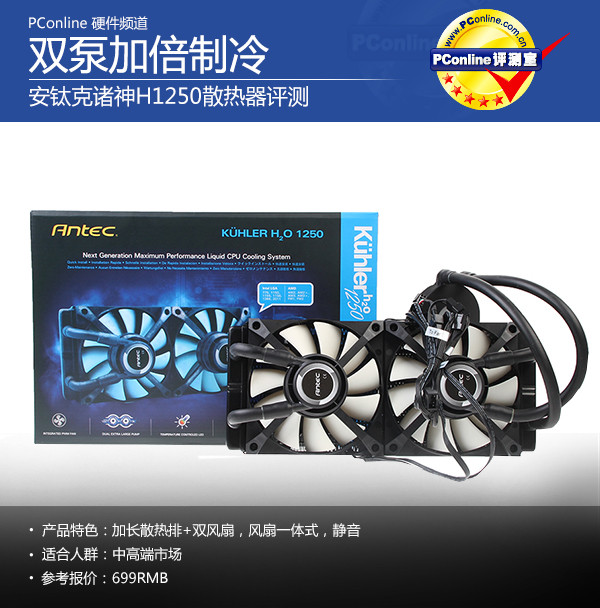 安钛克诸神H1250散热器作为诛神系列产品线中定位最高的散热器,无论从散热效果还是从制作工艺方面来说都体现出优异的水平。双泵式设计使到散热量呈增量提升,配合两个一体式的11叶强力静音风扇可以达到极佳的散热效果。安钛克诛神H1250散热器配备丰富的接线,支持Intel及AMD全平台。另一方面,水冷管都做了相应的防漏措施,导管弹性很好,长30cm,方便用户进行安装。目前这款散热器的报价为699RMB,对这款散热器有兴趣的用户可以在选购时关注一下。