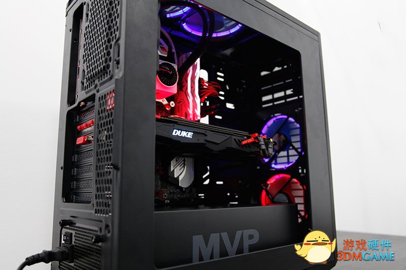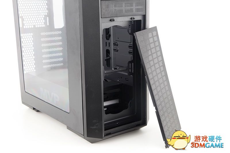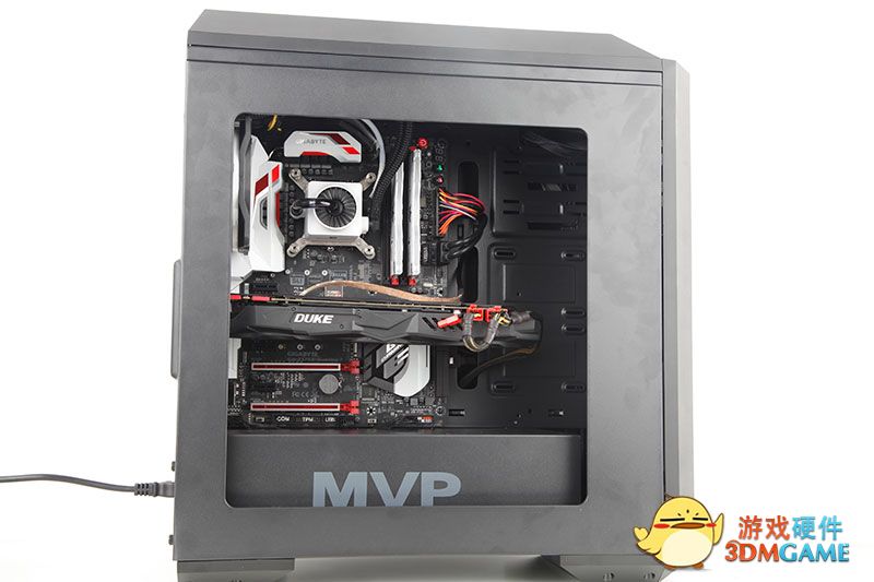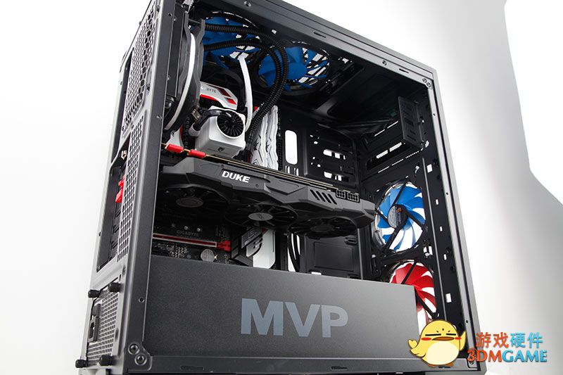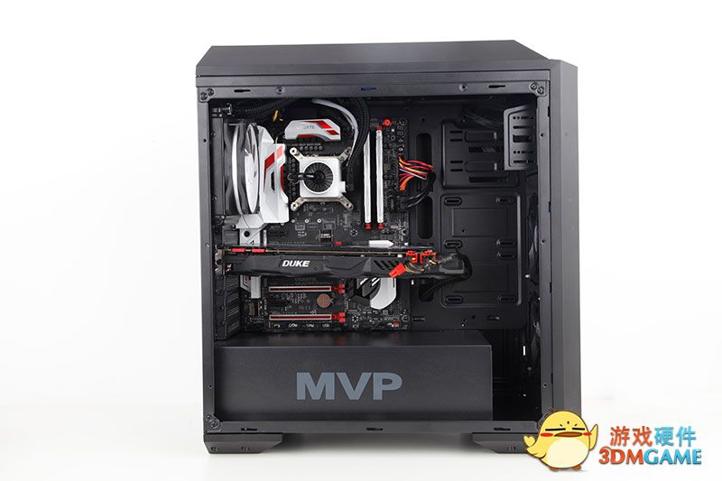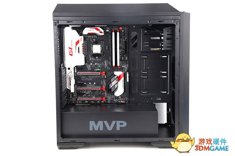 打开侧板,机箱的内部结构就映入了我们的眼睑,电源笼上有大大的"MVP"字样表明了它的身份!