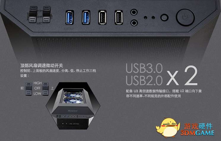 机箱的功能区也是一大特色,根据官方介绍说该款机箱支持双路风扇调速,一键开启风扇,可以在噪音与散热方面毫不妥协!