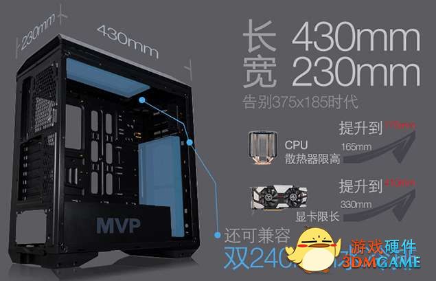 并且该款机箱的长和宽达到了430X230,也就是说可以轻松的放下大显卡和巨大的CPU散热器,毫无压力!