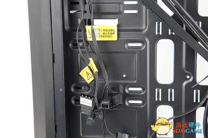 让我们打开另外一侧的盖板,所有的线都在这里,最显眼的就是一把风扇调速线,为了配合4个风扇的调速航嘉也是蛮拼的!
