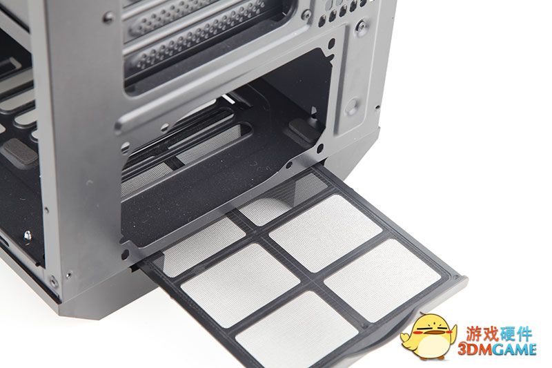 让我们眼前一亮的是该款机箱前面和上面的盖板都是可以轻松取下的,里面可以安装风扇或者是冷排,航嘉MVP Max在机箱顶部和前部采用了可拆卸式的防尘铁网(底部也有抽屉式防尘网),按下对应的开关,防尘铁网就会自行弹出,相比不少机箱使用的软性磁吸式防尘网,这种卡扣式防尘网的设计固定更加牢固。
