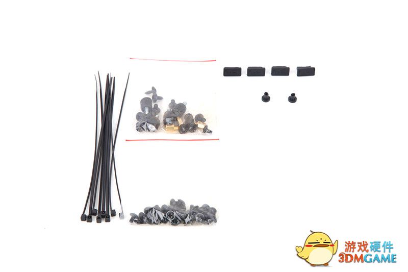 其中一个硬盘位里有螺丝包,还送了几个防尘用的接口塞子!
