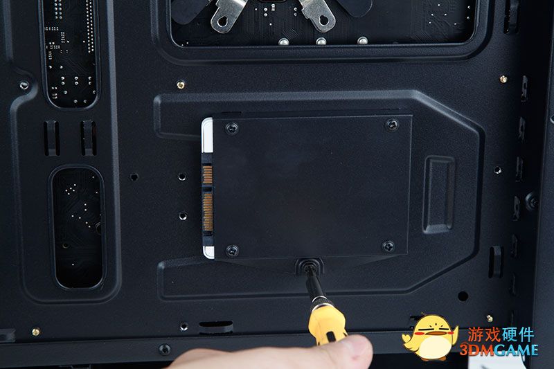 这一边还有一个固态硬盘的位置,采用侧装方式,很好的把SSD贴在了机箱板上!