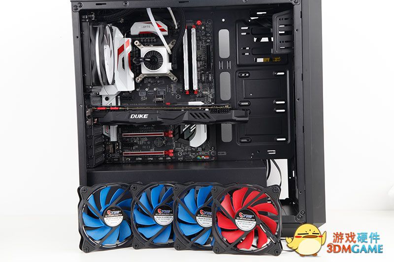 为了向大家展示该款机箱的风扇位,我向同事借来了4个12cm风扇!(中间出了个叛徒!)
