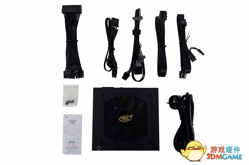 开箱后所有东西就都在这里了,除了DEEPCOOL的logo全部为黑色,在纯黑机箱里效果会很好,看起来十分协调,很贴心附送了四个备用螺丝,防止拆机后有螺丝遗失。线材有一些硬,估计在机箱里走线可能要费点劲。