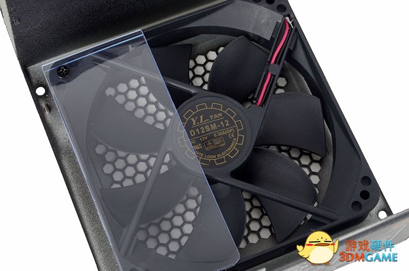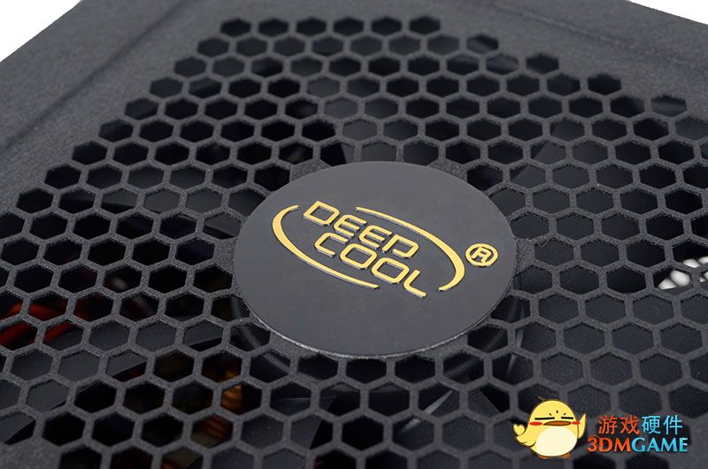 金色logo很显眼,后面是12cm大风扇。