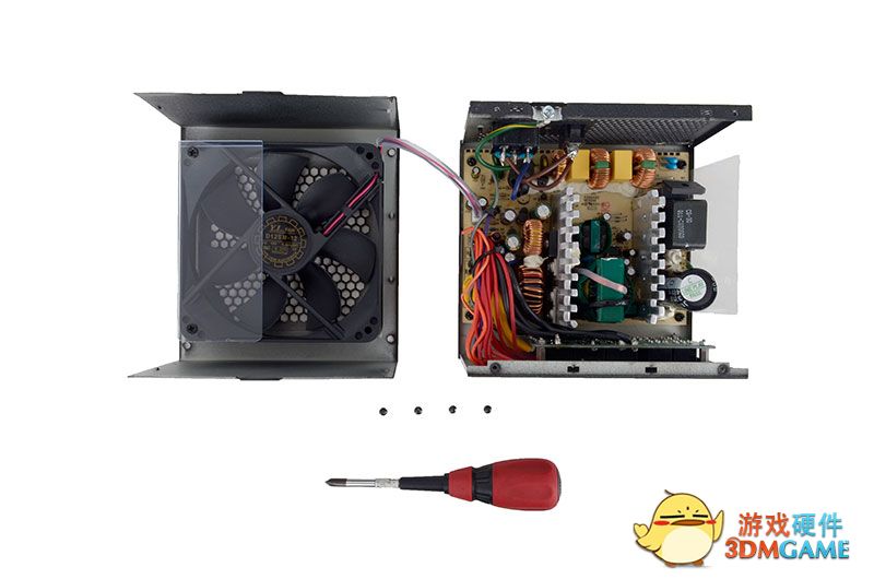 电源的拆解就很简单了,拆除四颗螺丝就可以了,要注意的是拆开时不要太粗暴,风扇的线长度很短。