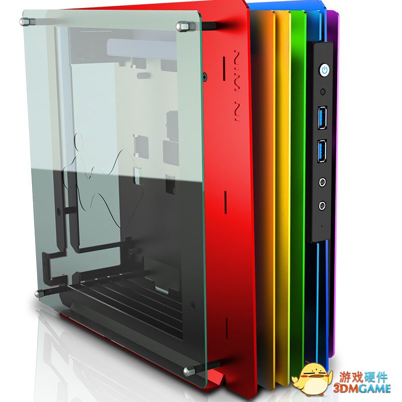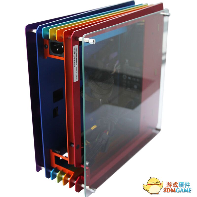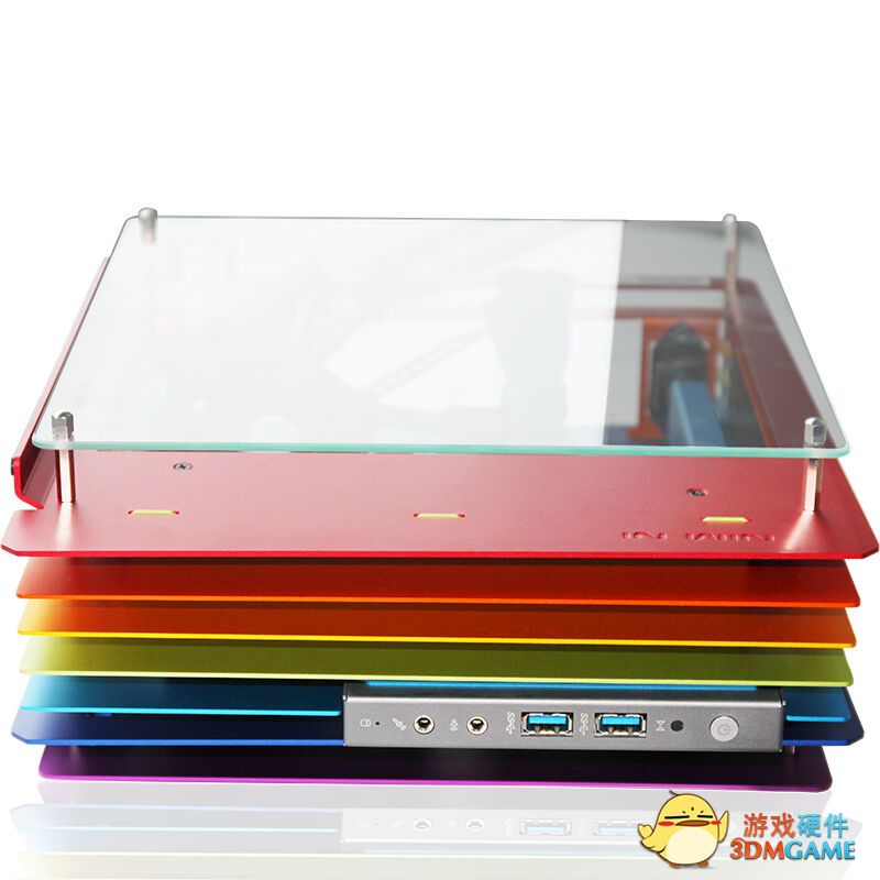 这款由顶尖DIY品牌迎广所推出的H-FRAME mini 彩虹版ITX机箱,经由曾经获得2014年度红点设计大奖的普通版H-FRAME mini机箱改良而来,全球限量300台。开放式的机箱设计,机箱整体由7片1.6mm左右的整片铝板经过镭射切割、阳极氧化制作而成,7色阳极铝板搭配钢化玻璃侧板让这款机箱变得“吸睛十足”,颇有现在世面上所流行的RGB彩虹渐变灯效的意味。