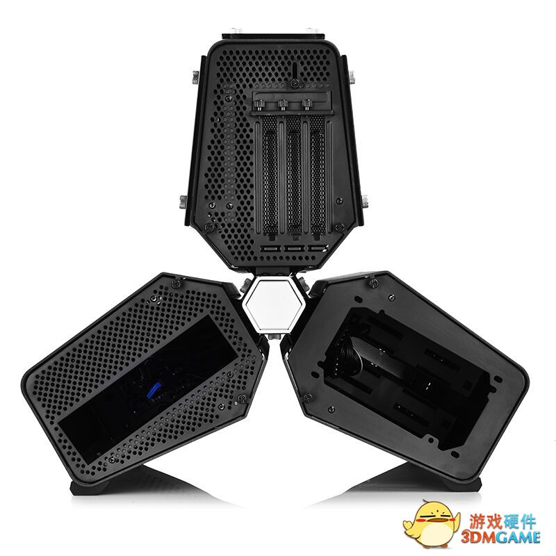 TriStella将几个部件分在3个空间中,其中一个是主板仓,支持Mini-ITX主板,还可以安装一体式水冷散热器,一个是显卡仓,可安装一张双槽显卡,通过PCI-E延长线转接,一个是电源和硬盘仓,支持最长18cm的ATX电源,可安装3个2.5寸或者2个3.5寸硬盘以及一个吸入式光驱。