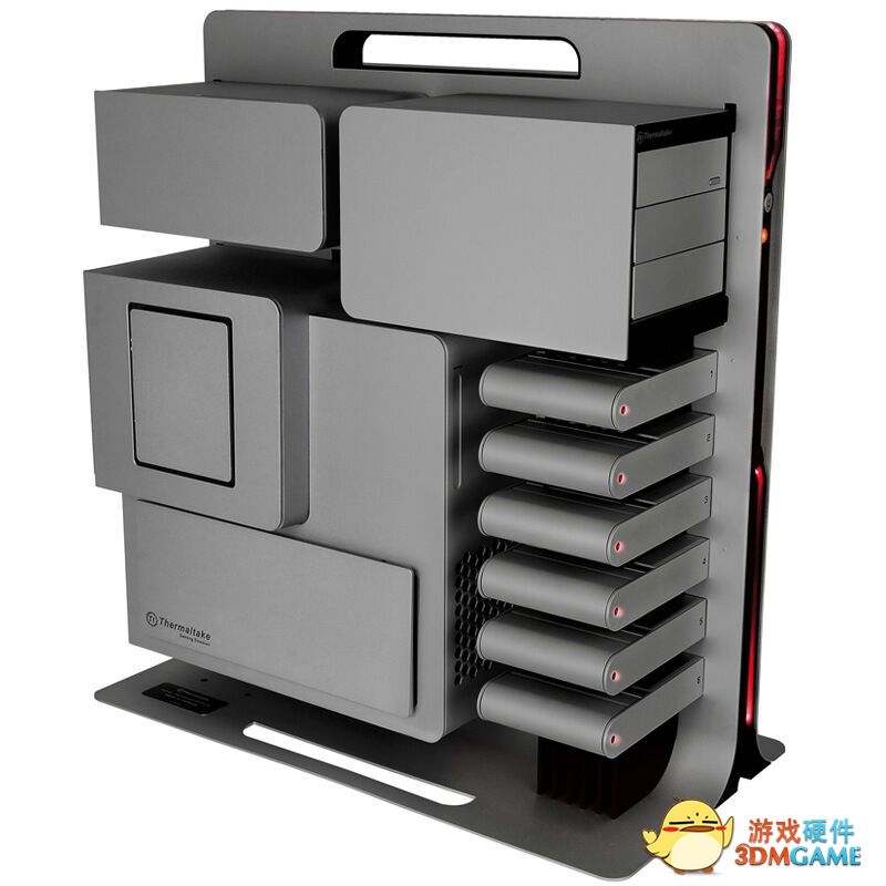 Tt Level 10钛金限量版的6个硬盘位支持热拔插3.5/2.5英寸硬盘,独特的硬盘托盘设计还强化了对硬盘的保护。此外,Tt还为Level 10钛金限量版量身定制了开放式独立散热系统,搭配4个散热风扇强化平台各部分的散热,有效降低系统硬件的运行温度。