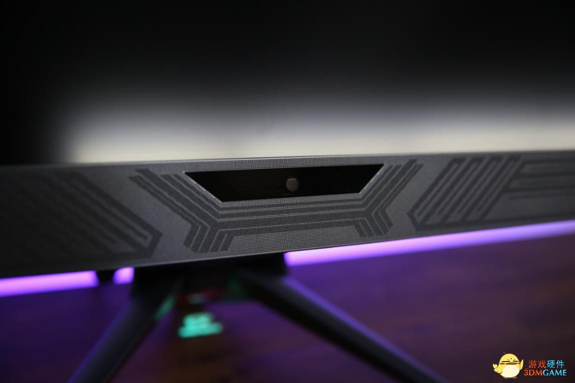 整机底部较为厚重的下巴,采用了极具电竞风格的纹路装饰。这里也是G-ONE自带音响的喇叭口,同时也附带了一个摄像头。