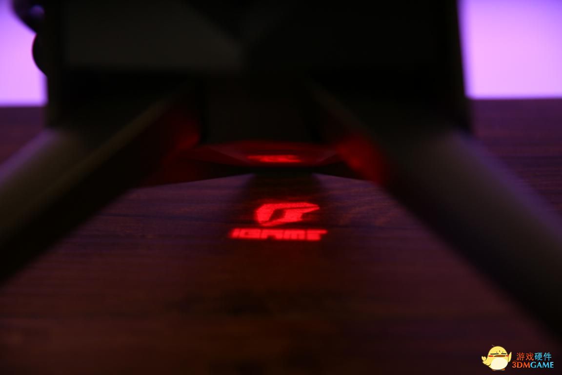 支架处的桌面投射灯,如今PC端灯效盛行,在显示器上也出现了不少的灯光元素。G-ONE的桌面氛围投射灯有着双重的倒影效果,并且会自行变色。